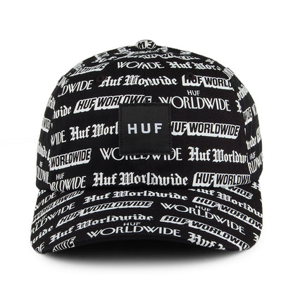 Here is the HUF Fake News Curved Visor Baseball Cap in black. The cap features Huf Worldwide written in a number of newspaper fonts all over the hat. There is a Huf patch sewn to the front. A Huf flip tag is attached to the adjustable strap at the back.