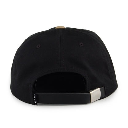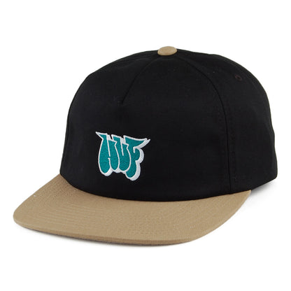Here is the HUF Jones NY Strapback Cap in black with a khaki brim. The cap is made of 100% cotton. It features a unique spraypaint style Huf logo on the front. There is a flip tag attached next to the adjustable strap at the back.