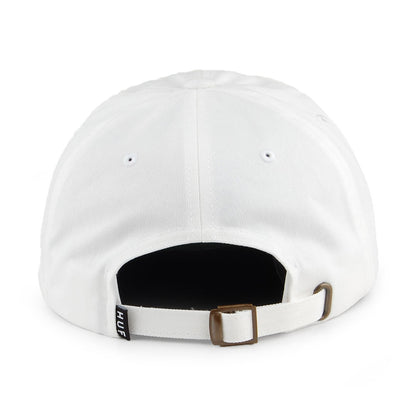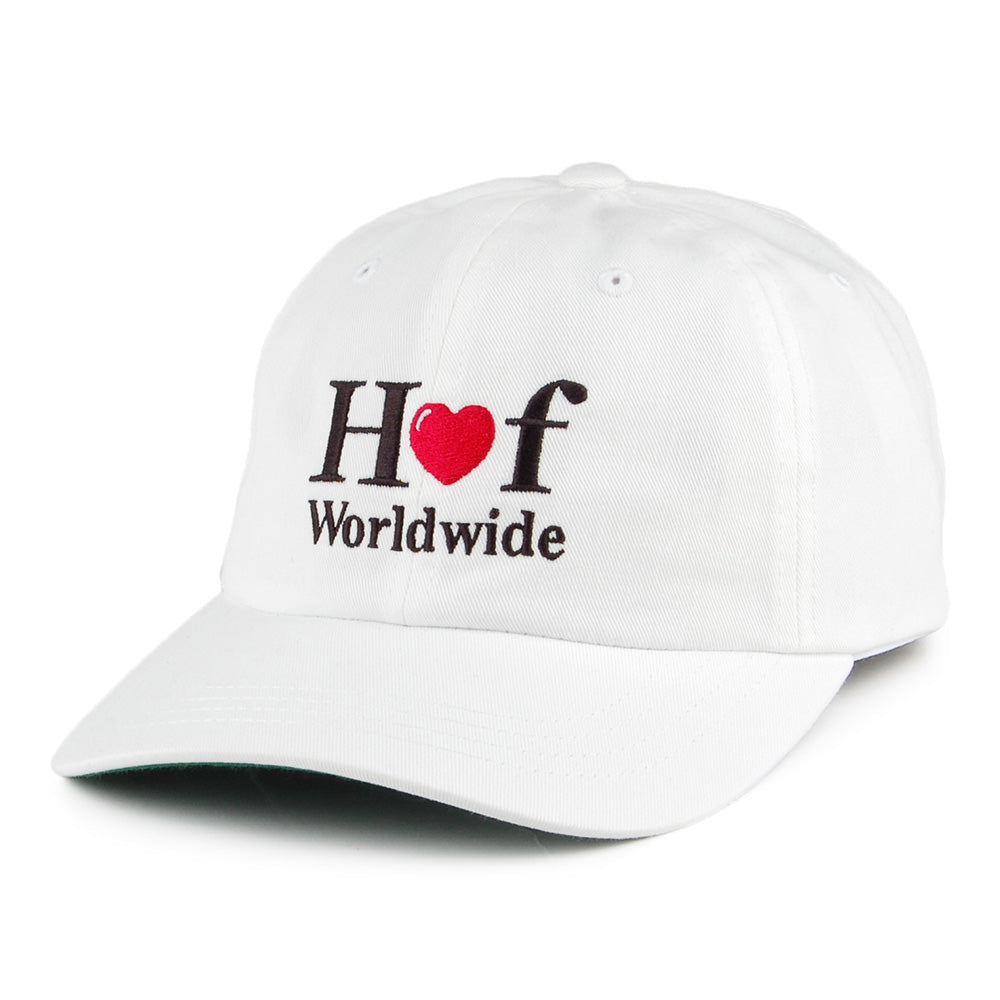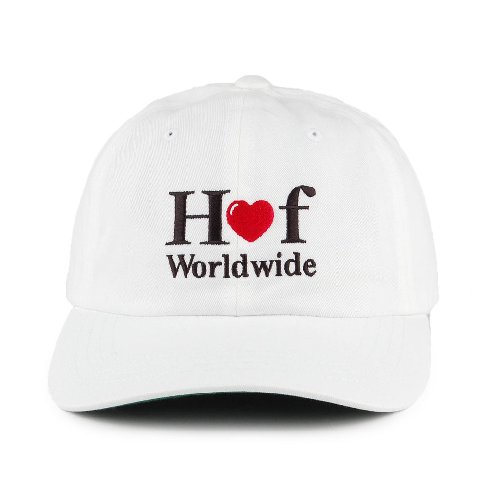 This is the HUF Love Curved Visor Baseball Cap in white. The cap is 100% cotton. It features Huf Worldwide embroidered on the front with a heart as part of the brand name. There is a flip tag at the back next to the adjustable strap.