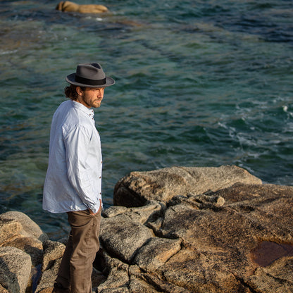 This grey Jaxon & James Crushable C-Crown Wool Felt Fedora is both dressy and practical. The back part of the crease at the top of the crown forms a big letter "C", therefore C-crown style fedora. This hat is crushable and water resistant. The hat has a snap brim, which means it can be worn up or down. You won't be able to find a classic look anywhere else.
