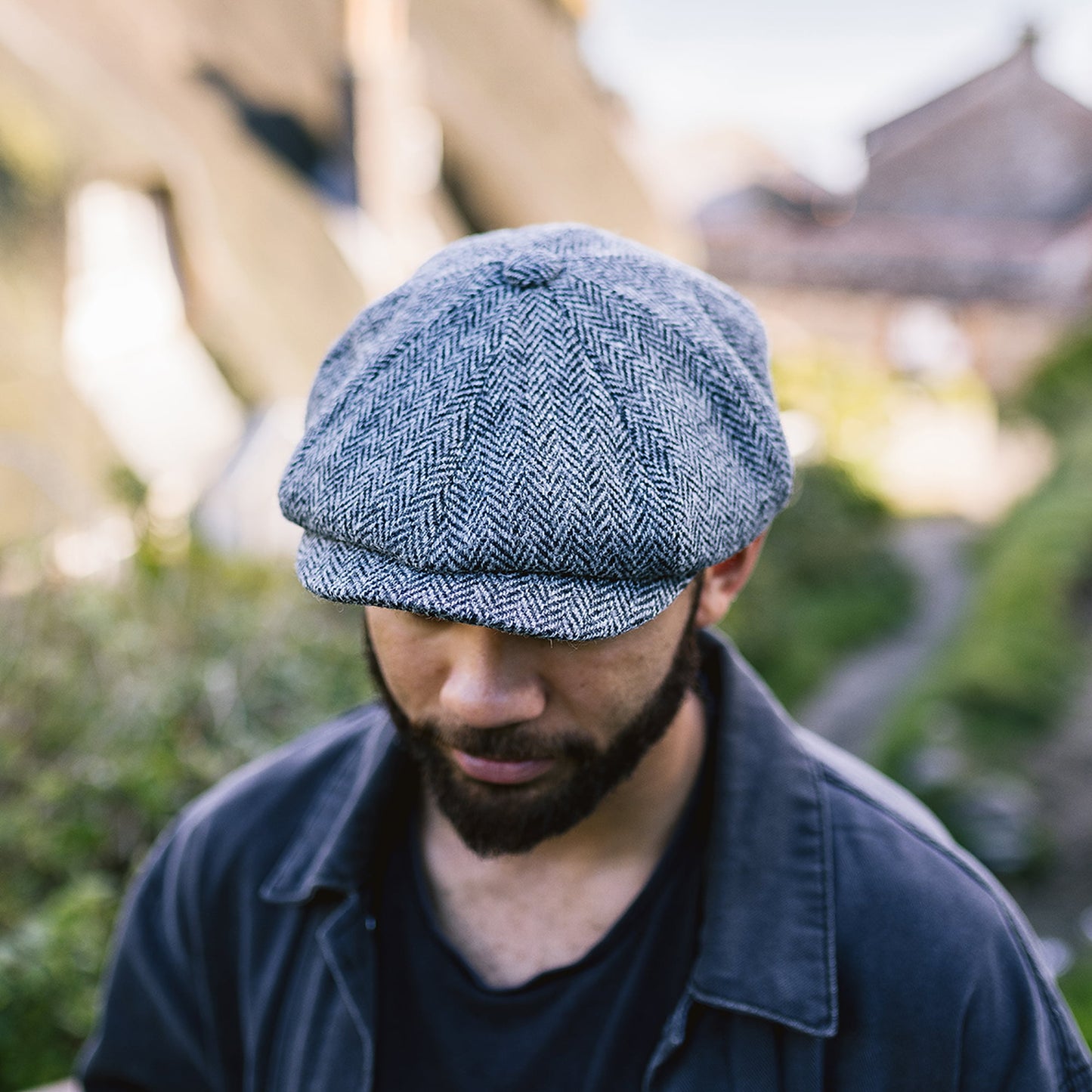 The Jaxon & James HARRIS TWEED Castlebay Newsboy Cap in black-grey is a simple and stylish design by the legendary hat makers. Inspired by the beautiful landscapes of the Outer Hebrides, the origin of HARRIS TWEED, we named this newsboy after the village Castlebay. Castlebay is surrounded by beauty, from Kisimul Castle to the views at Heaval. With that in mind we thought this was the perfect cap to be named after Castlebay, an aesthetically iconic black-grey herringbone Newsboy Cap.