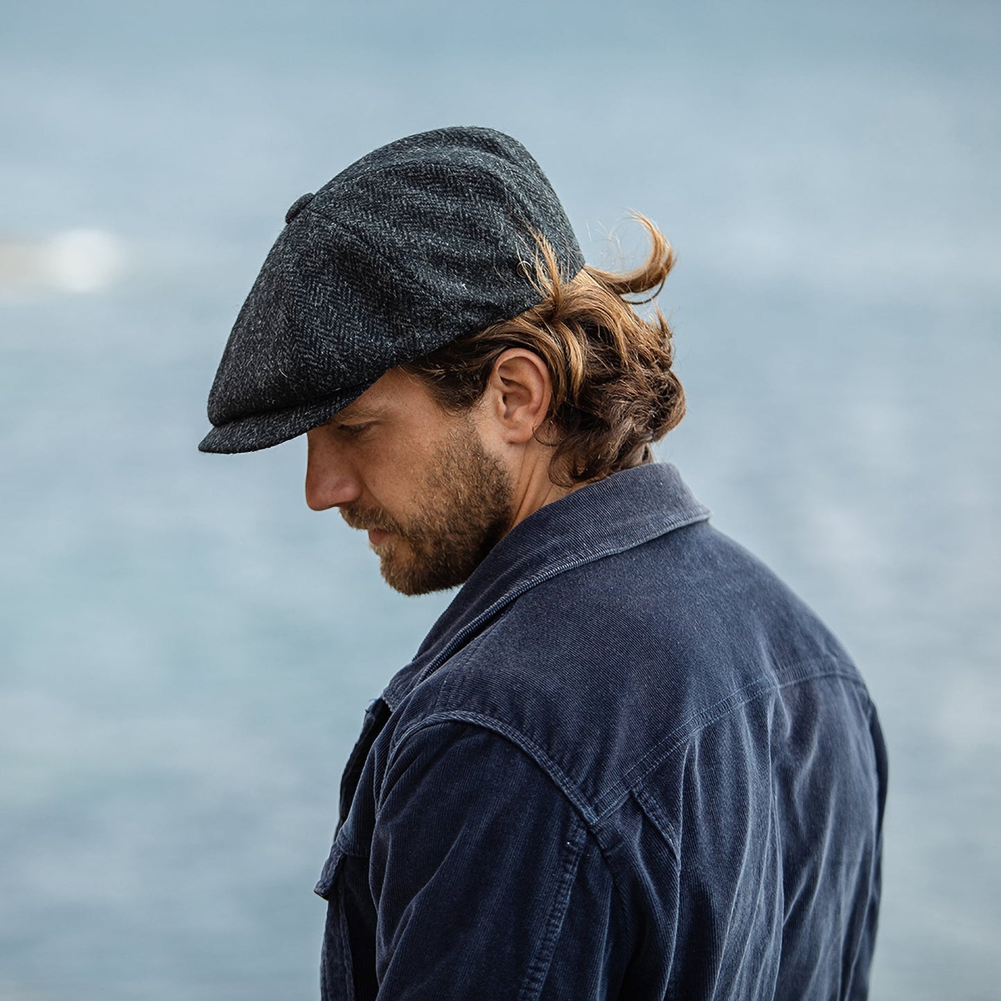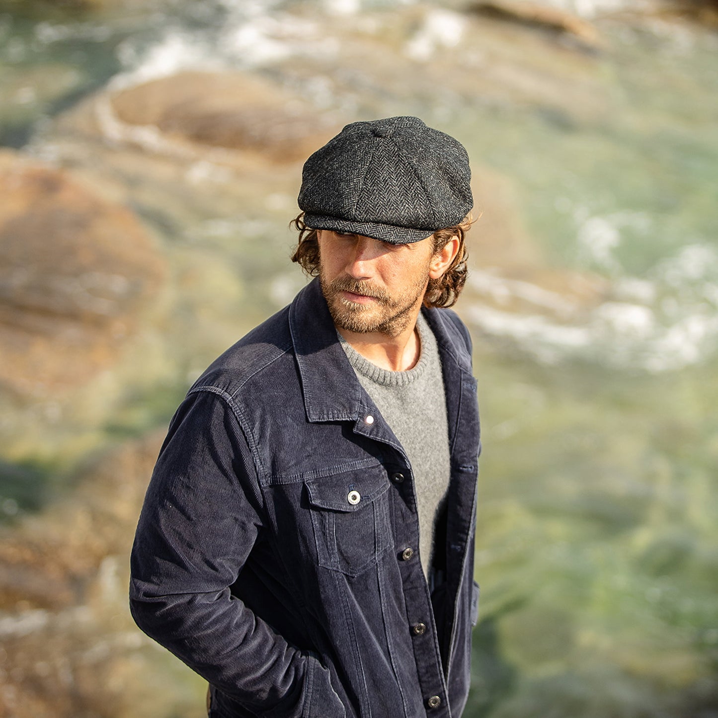 The Jaxon & James HARRIS TWEED Taransay Newsboy Cap in black-charcoal is a simple and stylish design by the legendary hat makers.