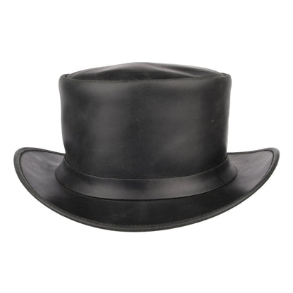 The Jaxon & James Leather Top Hat in black stands alone due to its slightly flared shallow 10.5cm high crown. The curved brim is wired and measures approximately 5cm wide. The hat is made of a thick durable leather which you can see and feel the quality immediately upon getting it into your hands. Unlined, it features an elasticized sweatband for a comfortable fit and is finished with a leather trim band at the base of the crown.