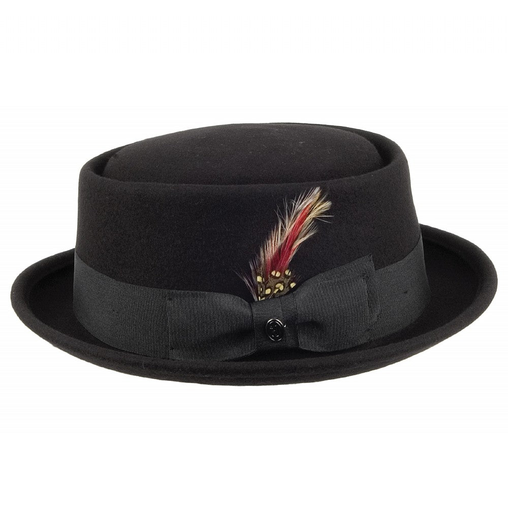 The Jaxon & James Wool Pork Pie Hat in black is a staple for any wardrobe. This modern take on the classic pork pie features a satin lining and is finished with a removable side-pin and feather.