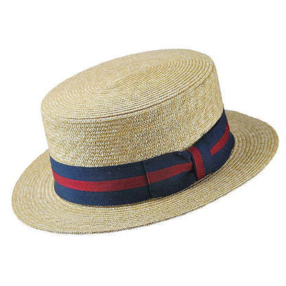 This is the Jaxon & James Straw Boater Hat with striped band in natural. The Boater was for many decades the man's straw hat of choice. Often associated with sailing, boating, barber shop quartets, jazz bands, and the like. The Boater was generally known as the warm weather hat.