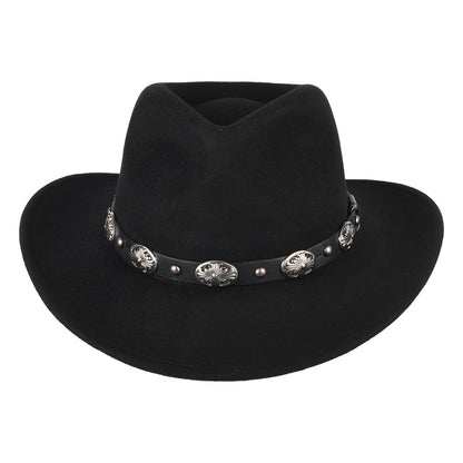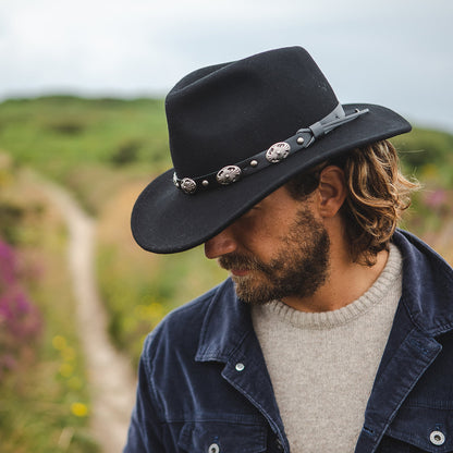 The Jaxon & James Tombstone Cowboy Hat is an excellent new style made of 100% wool felt. This versatile and practical hat is both crushable and water-resistant, making it an excellent travel hat. The Tombstone has a 10cm high, teardrop crown and a 7.5cm wide brim which dips front and back and curls up at the sides. The hat is finished with a fantastic hat conch band.