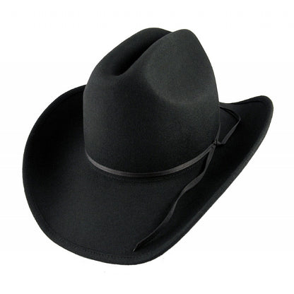 This Jaxon & James Western Cowboy hat in black is a classic! The 9cm wide brim has a hidden wire around the edge so that the hat can be shaped, even "cranked" to give you that radical bull-riding look if you like. The brim can also be shaped so that the hat looks like a classic rancher style; the two-ply trim completes that look. This 100% wool felt has also been scotch-guarded at the factory making it water-resistant. The crown is 10cm high.