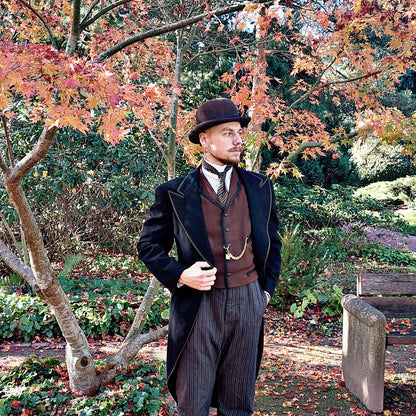 We don't think there is a better wool felt bowler (or derby) in brown out there! This style was created in 1850 as a hard hat for horseback riding while patrolling a game reserve by an English warden. In that tradition, this brown Jaxon & James version of the bowler is a little stiffer than its competitors. And in true English Style, a little shorter than the later American versions. The 100% wool felt quality is impressive and the hat comes fully lined with the Jaxon & James logo in the tips. The hat is trimmed with a grosgrain ribbon with a bow finish and side feather. The brim's edge in bound in grosgrain. For more info on bowlers see our info page on the Bowler in our Iconic Hats section.