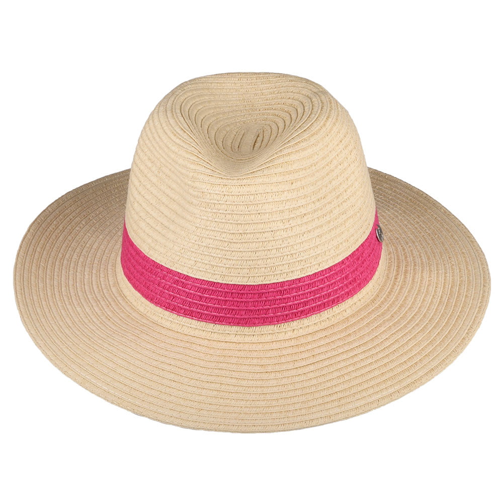 This is the Joules Hats Dora Summer Fedora Hat in natural. This hat is in natural and has a pink hatband woven into the crown to contrast the hat. There is a grosgrain sweatband for extra comfort in the inside which is unlined. The crown of this hat measures approximately 10.5cm high and the brim is approximately 7cm wide. This is a perfect hat for a day out in the sun!