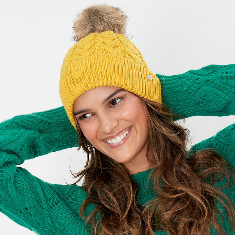 Joules Hats Elena Cable Knit Faux Fur Pom Bobble Hat - Mustard