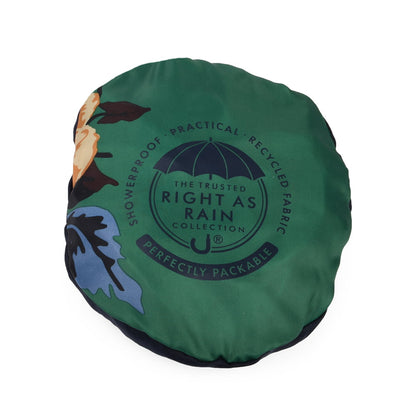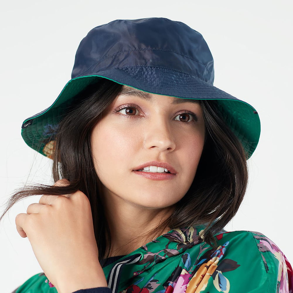 This is the Joules Milport Floral Rain Hat. The hat is made of a recycled showerproof material and features a green floral print on one side and if you flip it inside out it is solid navy blue on the other. You can fold the hat up into a pouch to easily put it in a bag or your pocket. There is an adjustable drawstring at the back to ensure a perfect fit.