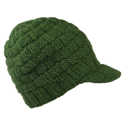 The Basket Weave Peaked Beanie hat in olive by Kusan is hand made from the mountains of Nepal using 100% wool. The peak of this beanie measures approximately 4cm deep in the centre. A leather Kusan badge is sewn to the side at the front of the hat. The inside of the hat features a fleece lining which is made from recycled plastic bottles.