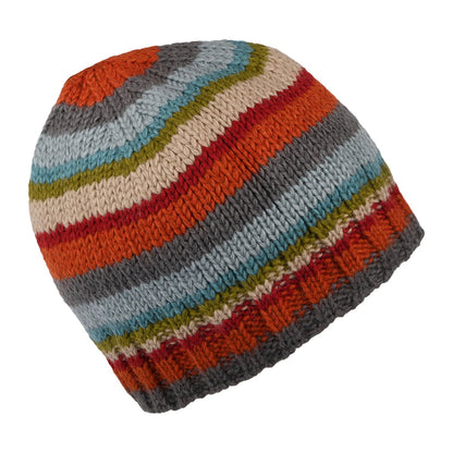 The Brooklyn Striped Beanie Hat in teal-orange from Kusan Hats is a fantastic, handmade hat from the mountains of Nepal. Made of wonderfully warm 100% wool, the beanie has a rib knit cuff with a striped pattern. The beanie has a fleeced lining and is finished with a leather Kusan badge on the side.