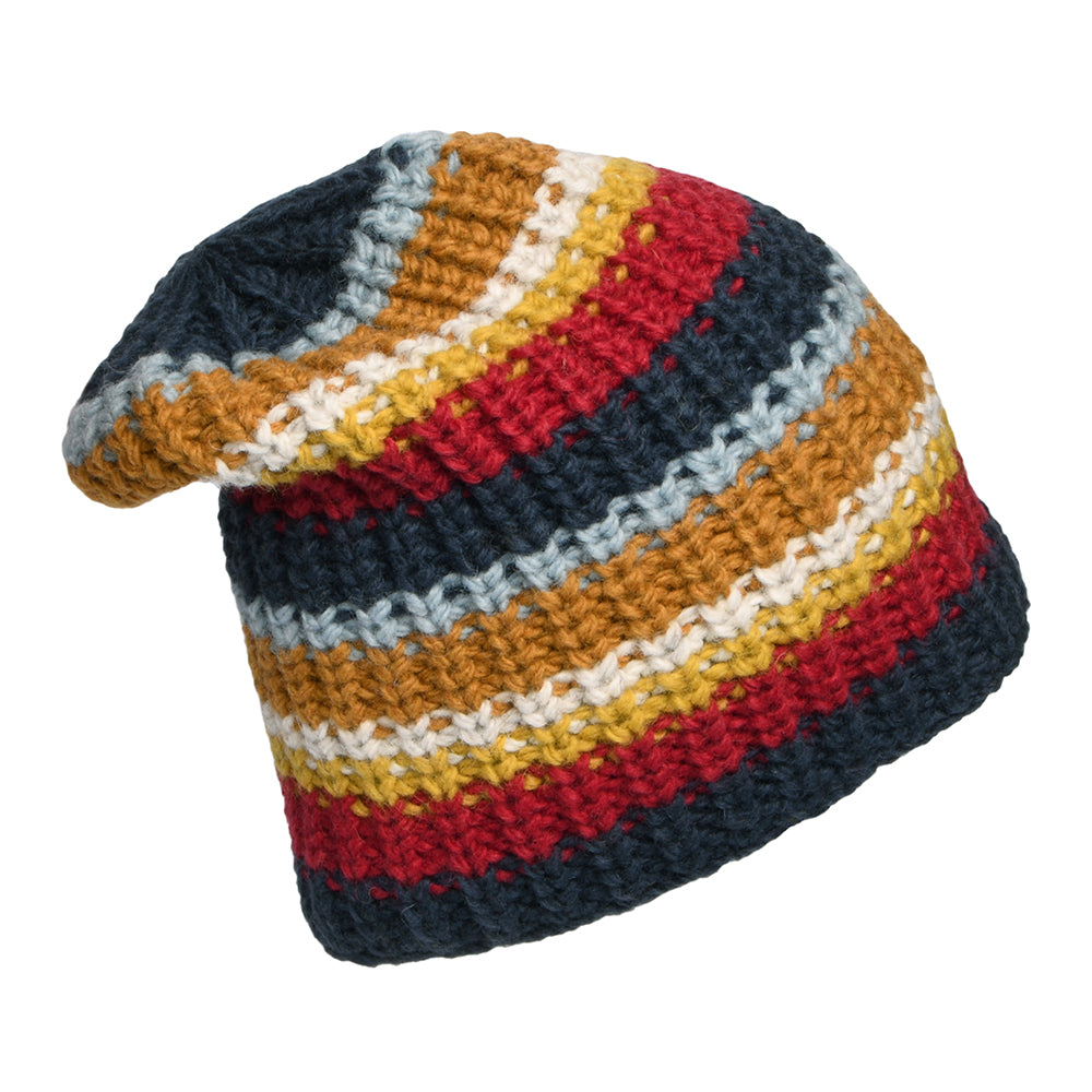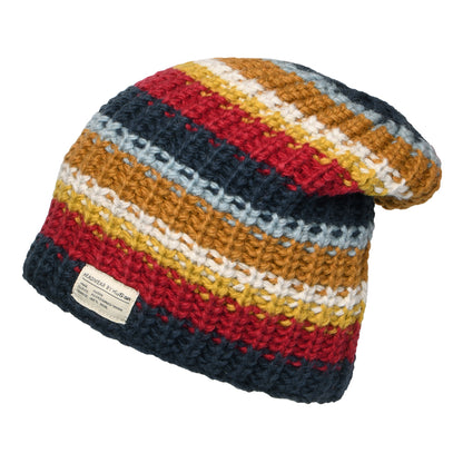 The Cardi Floppy Beanie Hat from Kusan in navy-yellow is an oversized wool beanie that has been handmade in Nepal. It has a great multi-coloured stripe pattern and a Kusan label sewn on the side. The inside of the hat features a fleece sweatband which is made from recycled plastic bottles.