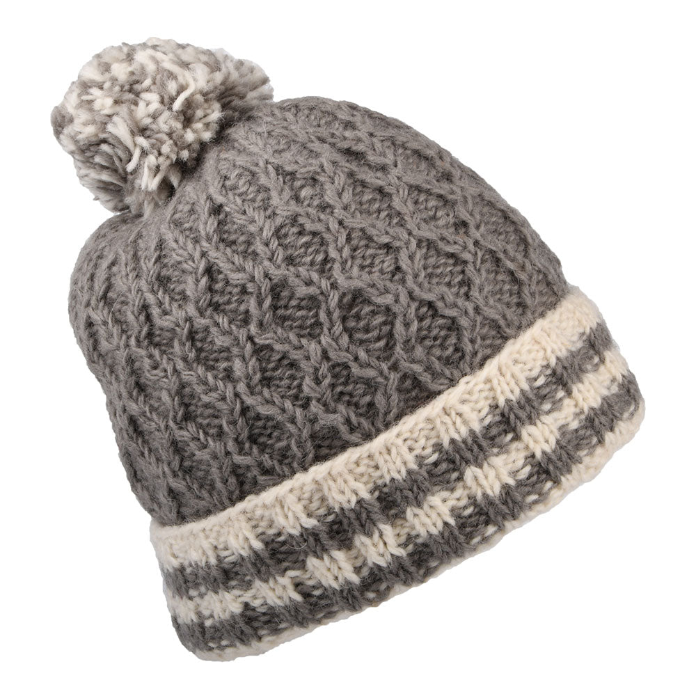 Kusan Diamond Knit Striped Cuff Bobble Hat - Grey-Multi