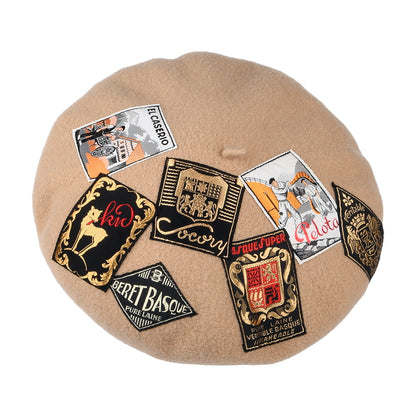 The Laulhère Eridan Vintage Patch Merino Wool Beret in sand is a stunning and unique hat from the famous beret manufacturer. The hat is decorated with vintage patches and each hat is unique and varies due to a different selection of patches. This thick merino wool beret features a satin lining for comfort and a leather sweatband. A small Laulhère pin is affixed to the side of the beret. An outstanding beret for a unique style!
