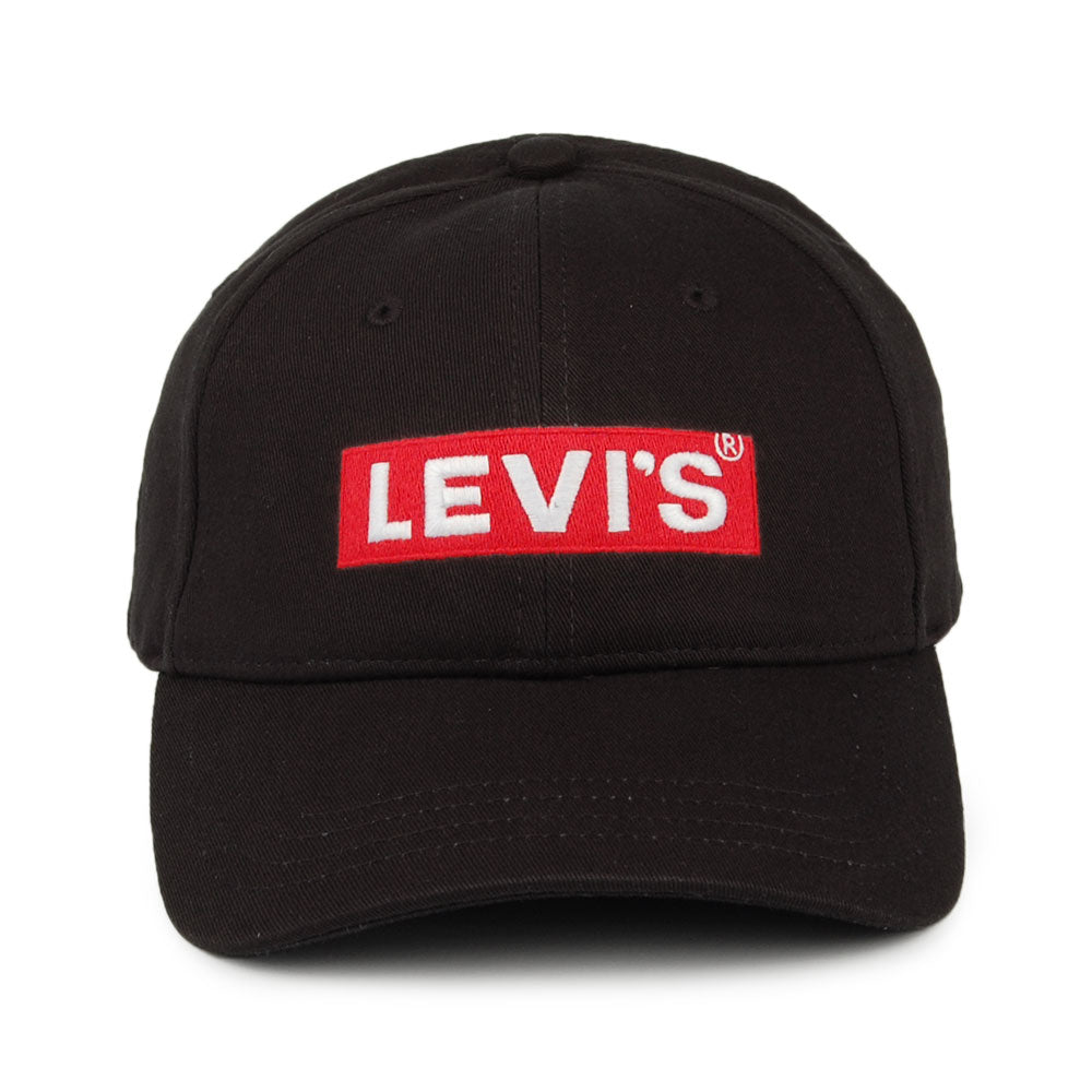 This is the Levi's Box Tab Baseball Cap in black. The cap features the Levi's logo embroidered on the front in a box. The cap has a pre-curved brim, eyelets for ventilation and an adjustable strap at the back with a Levi's flip tag attached on its side. The cap is made of 100% cotton.