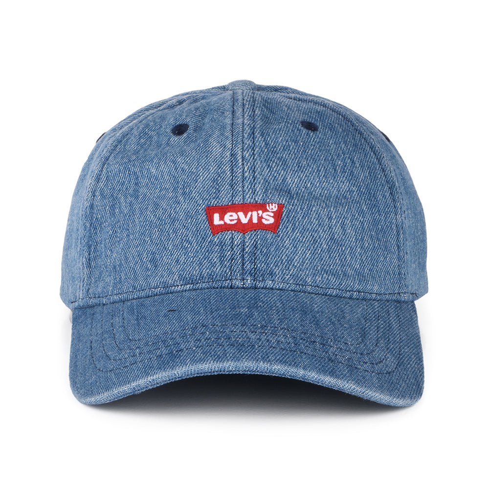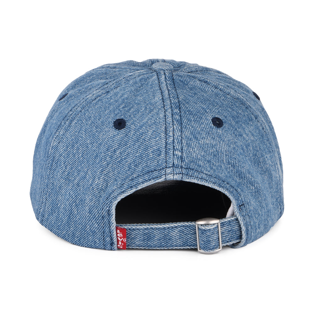 The Levi's Hats Housemark Denim Baseball Cap in blue is made from a sturdy cotton twill. It features the Levi's logo embroidered on the front of the unstructured crown. A Levi's fliptag can be found next to the adjustable strap at the back.