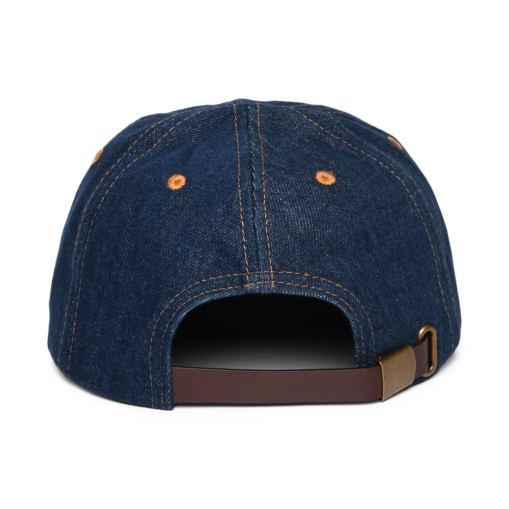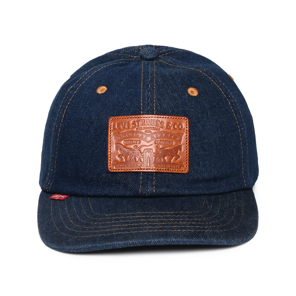 The Levi's Relaxed Heritage Denim Baseball Cap in dark blue is made from 100% cotton. It features a Levi's leather patch sewn on the front of the unstructured crown. A Levi's flip tag can be found next to the adjustable leather strap at the back.