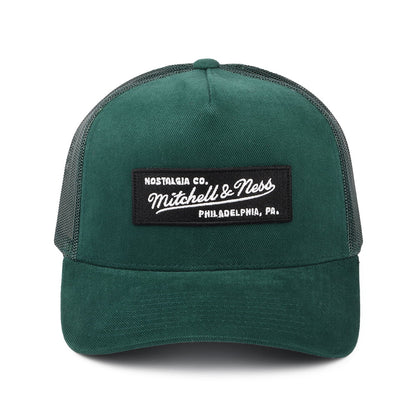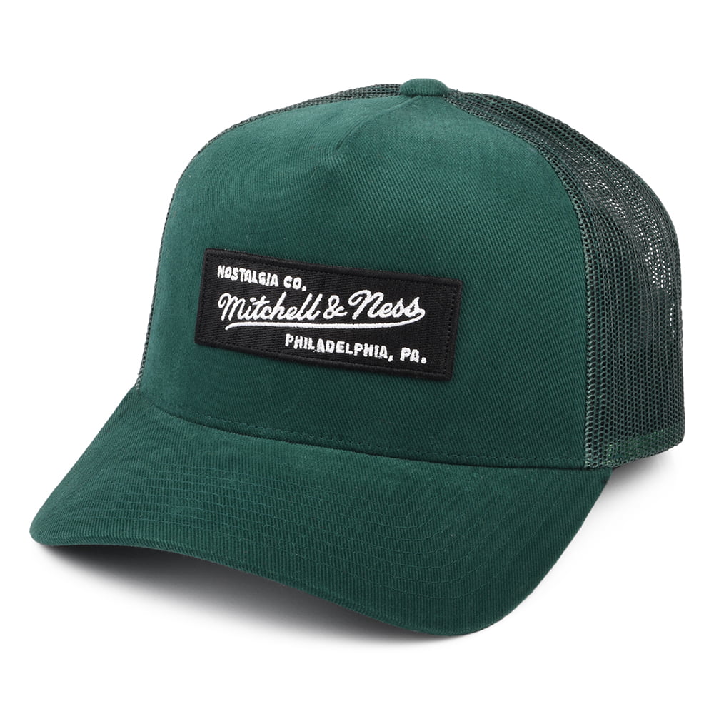 This is the Mitchell & Ness Branded Box Logo Classic Trucker Cap in dark green. This cap features a cotton front with the Mitchell & Ness box logo in the centre. The mesh back features the company name embroidered above the adjustable strap.
