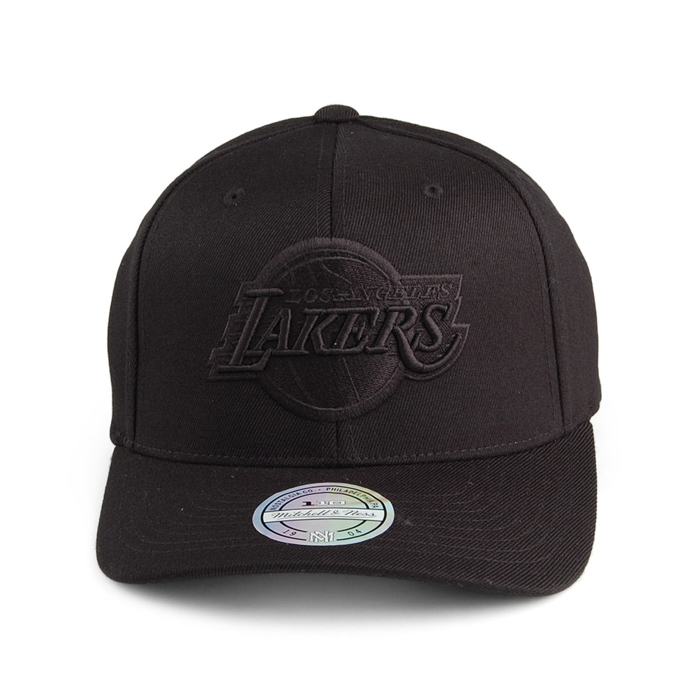 This is a classic Mitchell & Ness L.A. Lakers 110 baseball cap in black with a black logo. This hat features a slightly curved brim with the team logo embroidered on the front and the Mitchell & Ness logo is embroidered on the back above the adjustable snap. Eyelets in the crown encourage ventilation.