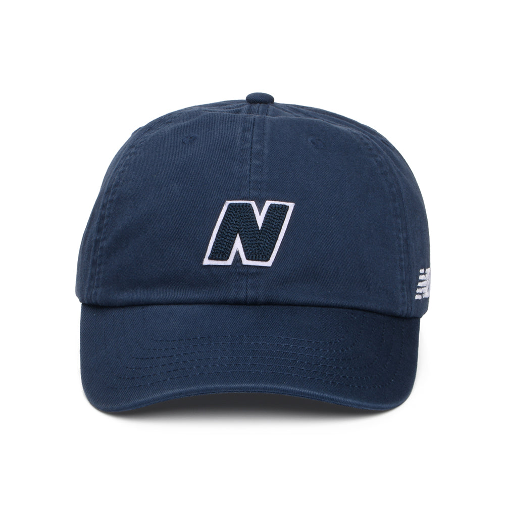 The New Balance Block N V 2.0 Baseball Cap in navy blue is made of 100% washed cotton and features a New Balance patch sewn on the unstructured front and the New Balance logo embroidered on the left side. The back of the hat has an adjustable strap with metal claps so it fits most sizes comfortably.