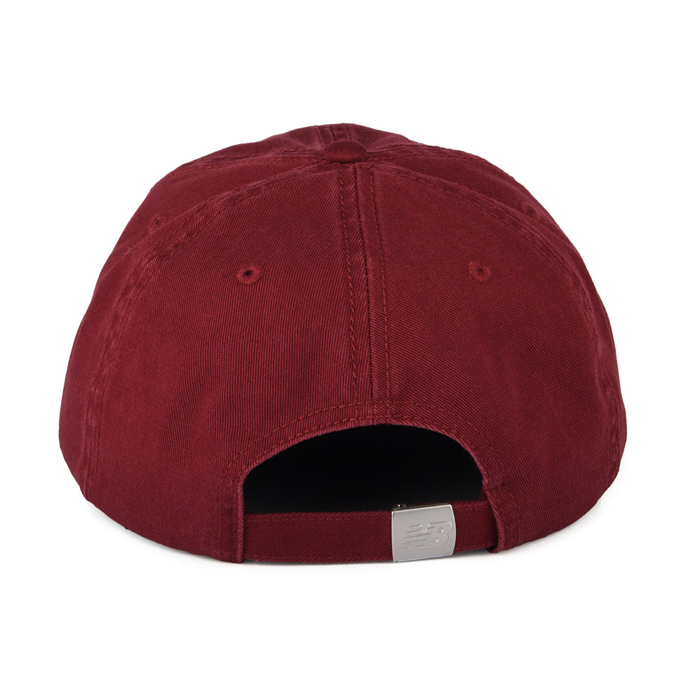 The New Balance Classic NB Curved Brim Baseball Cap in dark red is made of 100% cotton and features the New Balance logo embroidered on the unstructured front. The back of the hat has a metal clasp and an adjustable strap so it fits most sizes comfortably.