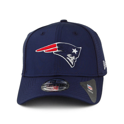 This is the New Era 39THIRTY New England Patriots Baseball Cap - Featherweight in navy blue. The cap features the team logo embroidered on the front. The New Era logo is embroidered on the side. The team name is printed on a strip running down the back of the hat. As it is a 39THIRTY, it has a sweat band that stretches for a perfect fit.