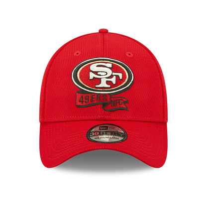 This San Francisco 49ers baseball cap in red is worn by the team while on the sideline during the game. The hat features the team logo embroidered on the front with a banner underneath with the team name as well as the conference the team is in, The NFC. The New Era flag is embroidered on the left side and the NFL league logo is embroidered on the right side. The team logo is embroidered at the back. As it is a 39THIRTY, the hat features a pre-curved brim and a sweatband that stretches for a perfect fit.
