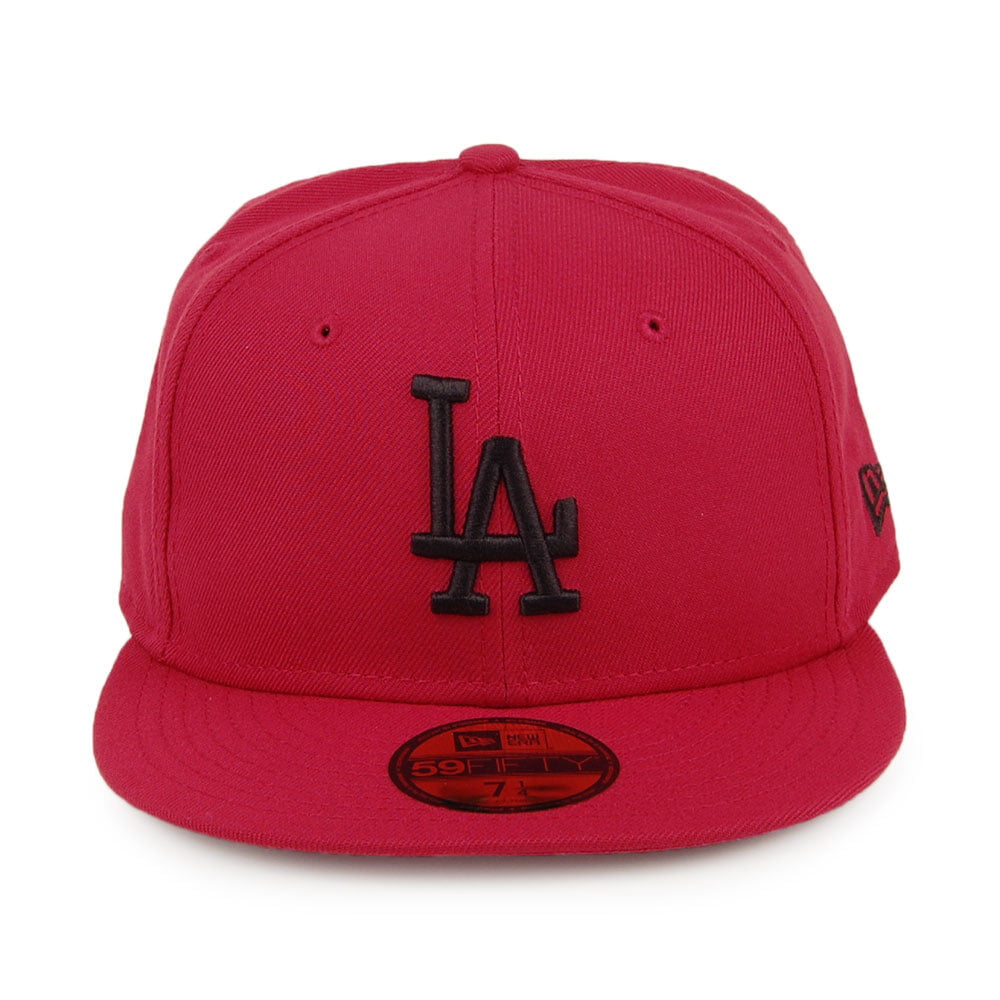 This is the 59FIFTY Los Angeles Dodgers League Essential Baseball Cap in cardinal-black. The cap features the team logo in white on a scarlet red cap. This cap is 100% polyester with flat brim and 3D letters. The New Era logo is embroidered on the side of the cap and the MLB logo is embroidered at the back.