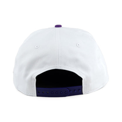 The 9FIFTY L.A. Lakers Snapback Cap in white-purple is from the NBA Retro line by New Era. The cap is a genuine 9FIFTY snapback style with eyelets and adjustable snap at the back. The team name is boldly embroidered on the front and the New Era logo is on the side. The colour of the brim matches the button on the top and the snapback at the back. The cap has a green underbrim.
