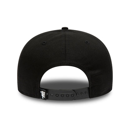 The New Era 9FIFTY Manchester United FC Baseball Cap in black on black is made of 100% cotton. It features a rubber team logo on the structured front and the New Era flag embroidered on the side. There is an adjustable snap at the back to help this cap fit comfortably.