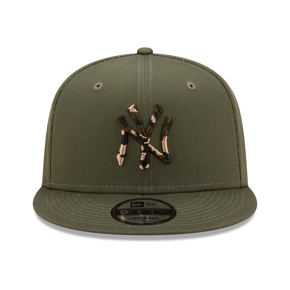 The New Era New York Yankees Baseball Cap - MLB Camo Infill in olive is a new 9FIFTY snapback. The cap features the team's logo in camouflage embroidered on the front and the New Era flag embroidered on the side. There is an adjustable snap at the back of the cap to ensure a great fit.