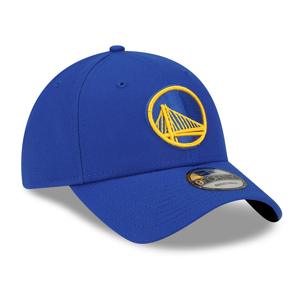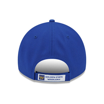 Here is the New Era 9FORTY NBA The League Golden State Warriors Baseball Cap in blue. This New Era 9FORTY is a structured cap with the team's logo on the front panel and embroidered New Era flag on the left side. The six panel construction features breathable eyelets with a curved visor. An adjustable hook-and-loop strap at the back featuring the team's name and logo ensures a comfortable fit.