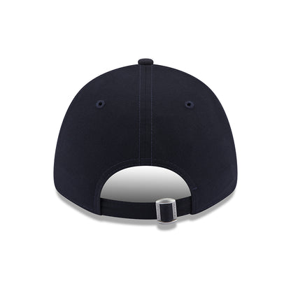 The 9FORTY L.A. Dodgers MLB Repreve Baseball Cap from New Era in navy on navy features the team's logo embroidered on the structured front panels and the New Era flag embroidered on the left side. It is made of 100% recycled fabric from plastic bottles and comes with a curved brim and eyelets for ventilation. There is an adjustable snap at the back for easy sizing.