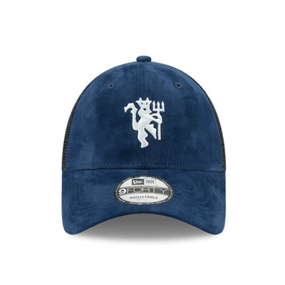 This is the New Era 9FORTY Manchester United Suede Trucker Cap in navy blue. The cap features the Manchester United devil on the front of the cap. The New Era flag is embroidered on the side and there is an adjustable snap at the back of the cap.