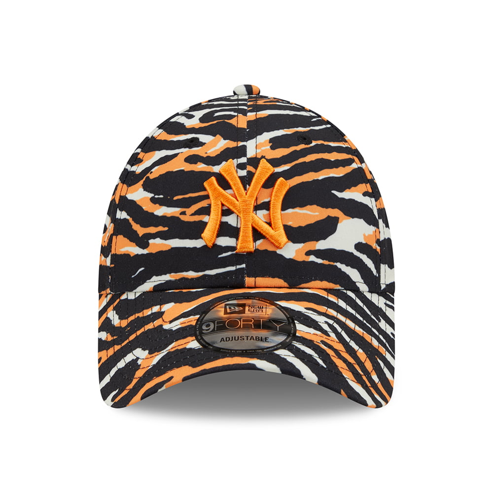 The New Era 9FORTY New York Yankees MLB AOP Camo Print Baseball Cap in stone-orange is a striking new style for the season. The baseball cap features an all-over tiger pattern, the team's logo embroidered on the structured front panels and the New Era flag embroidered on the left side. The six panel construction features breathable eyelets with a curved visor. There is an adjustable strap with a metallic buckle at the back for easy sizing.
