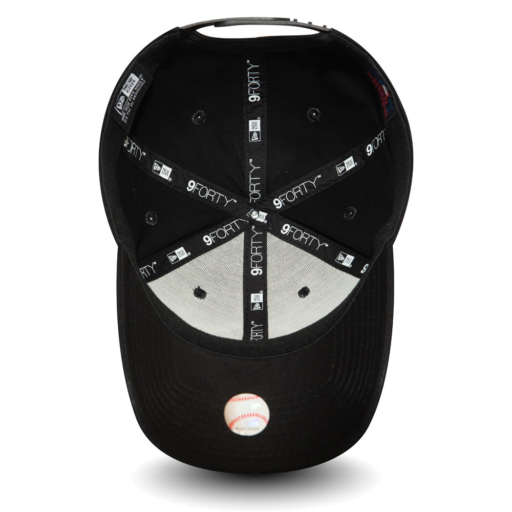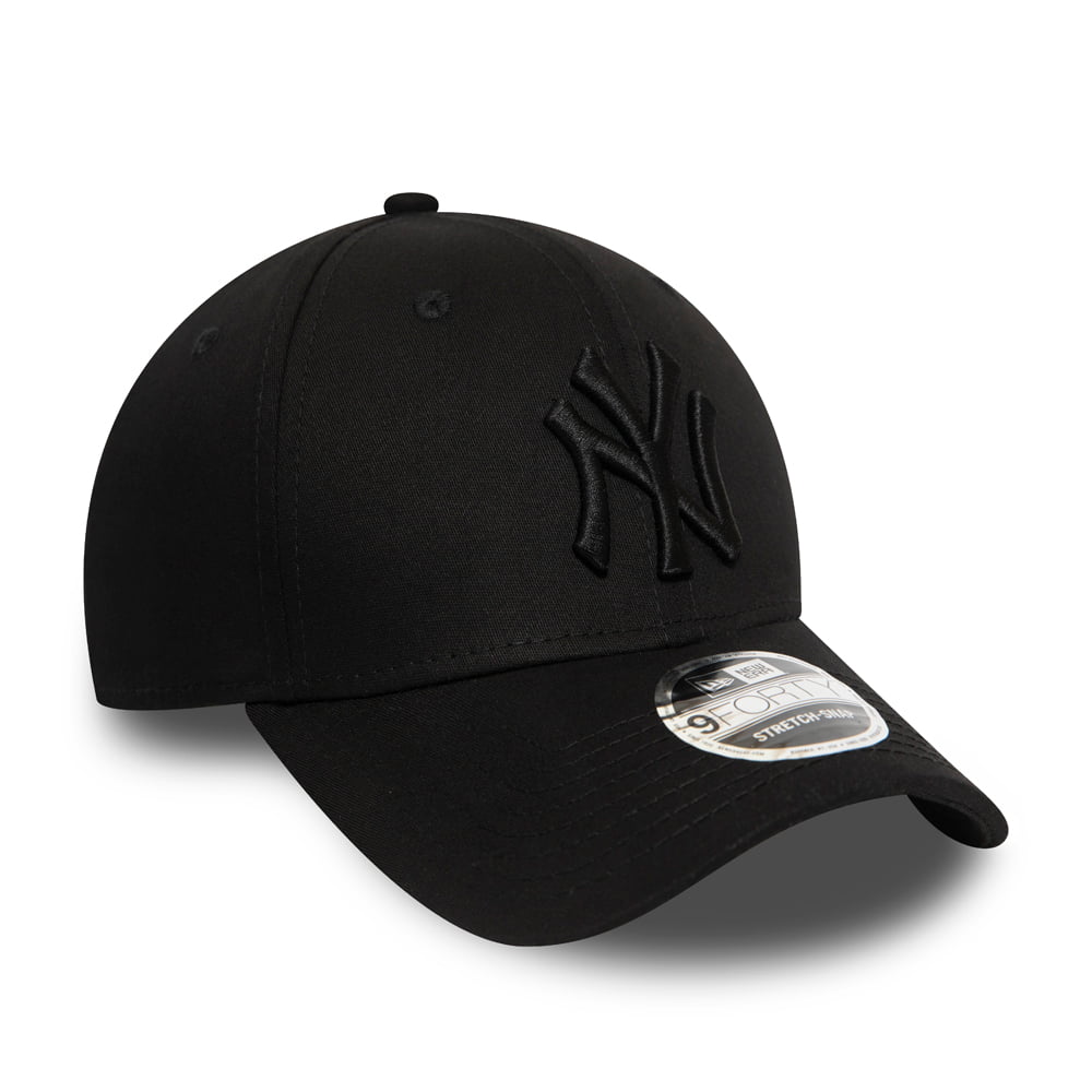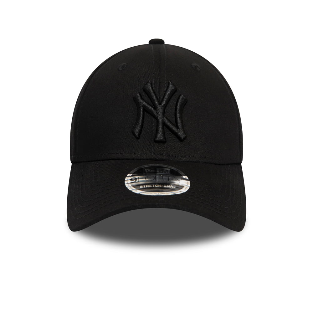 New Era 9FORTY New York Yankees Stretch Snap Black on Black Baseball Cap. The team logo is embroidered on the front in black on a black hat. The New Era flag is embroidered on the side of the cap. There is an adjustable snap at the back of the cap to ensure a great fit.