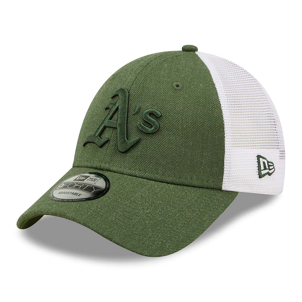 The 9FORTY Oakland Athletics MLB Home Field Trucker Cap from New Era in olive heather features the team's logo embroidered on the structured front panels and the New Era flag on the left side. The mesh back is finished with an adjustable hook-and-loop strap with the team's name and logo.