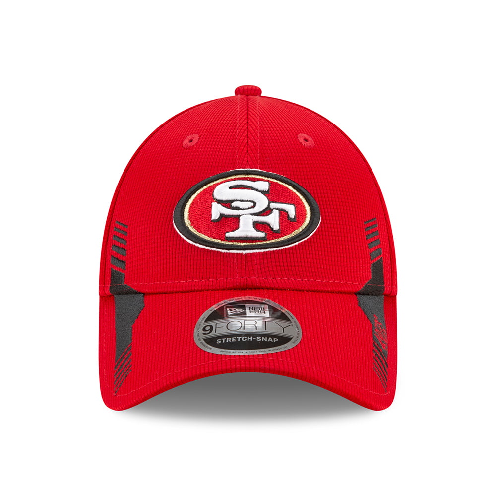 Here is the New Era 9FORTY San Francisco 49ers NFL Sideline Home Stretch Snap Baseball Cap in red-black. This 9FORTY stretch snapback features the team's logo on the front, the New Era flag embroidered on the side and the NFL logo embroidered at the back. The team name is embroidered on the side of the pre-curved brim. There is an adjustable snap at the back of the cap to ensure a great fit. There is also a bit of stretch in the sweatband to give that extra comfort.