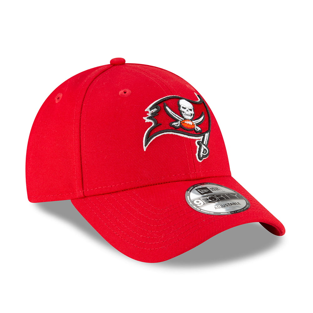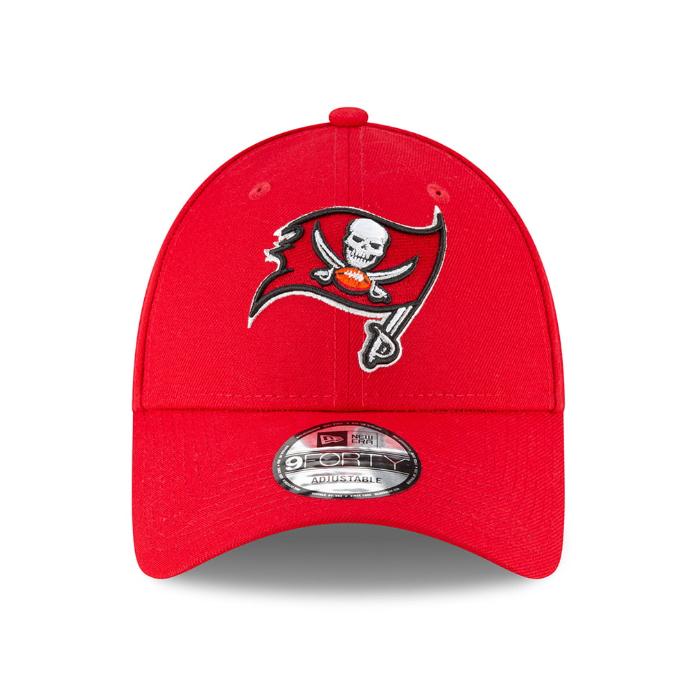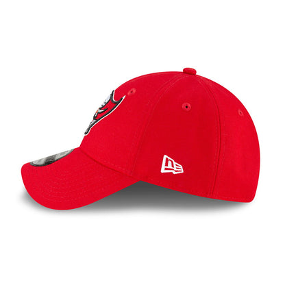 This is the New Era 9FORTY NFL The League Tampa Bay Buccaneers baseball cap in red. The cap features an embroidered team logo on the front panel and New Era® flag embroidered on the wearer's left side. The six panel construction features breathable eyelets with a curved visor and button on top. The open back has an adjustable hook-and-loop strap with the team name and logo on it.