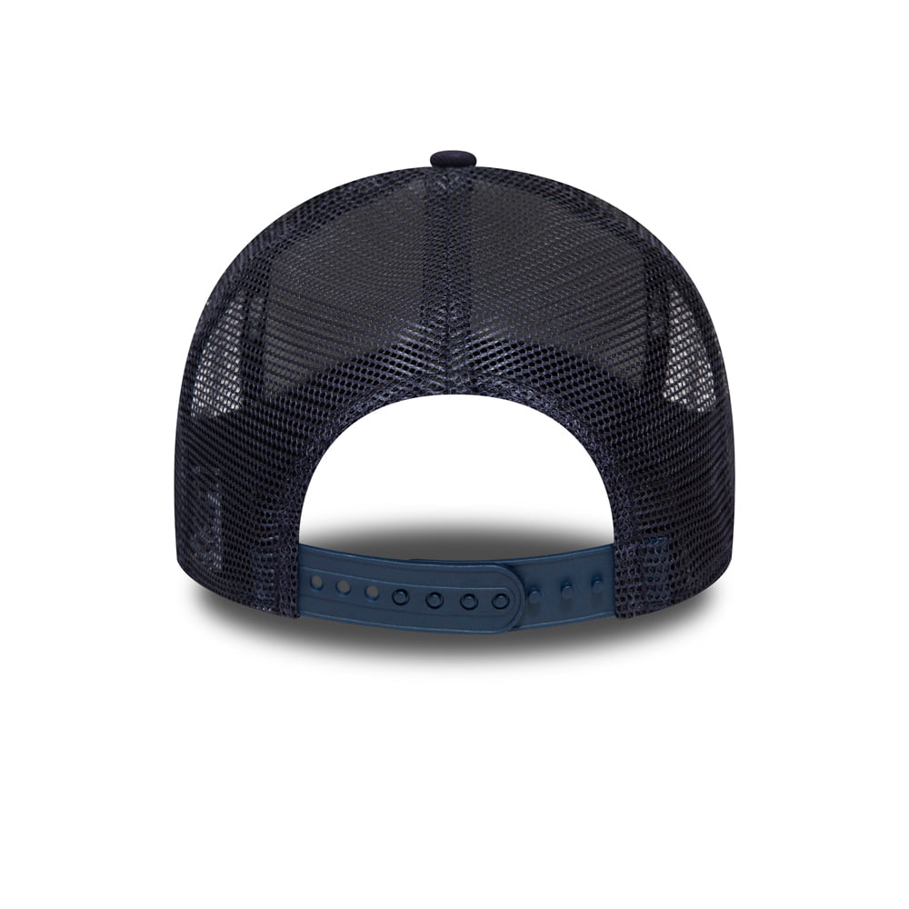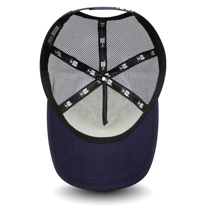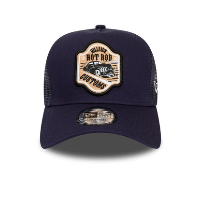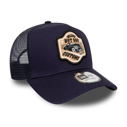 This is the New Era Hot Rod Trucker Cap in navy blue. The cap features a hot rod patch on the front of the cap. The New Era flag is embroidered on the side and there is an adjustable snap at the back of the cap. This is a great summer cap with the mesh back to keep you cool.