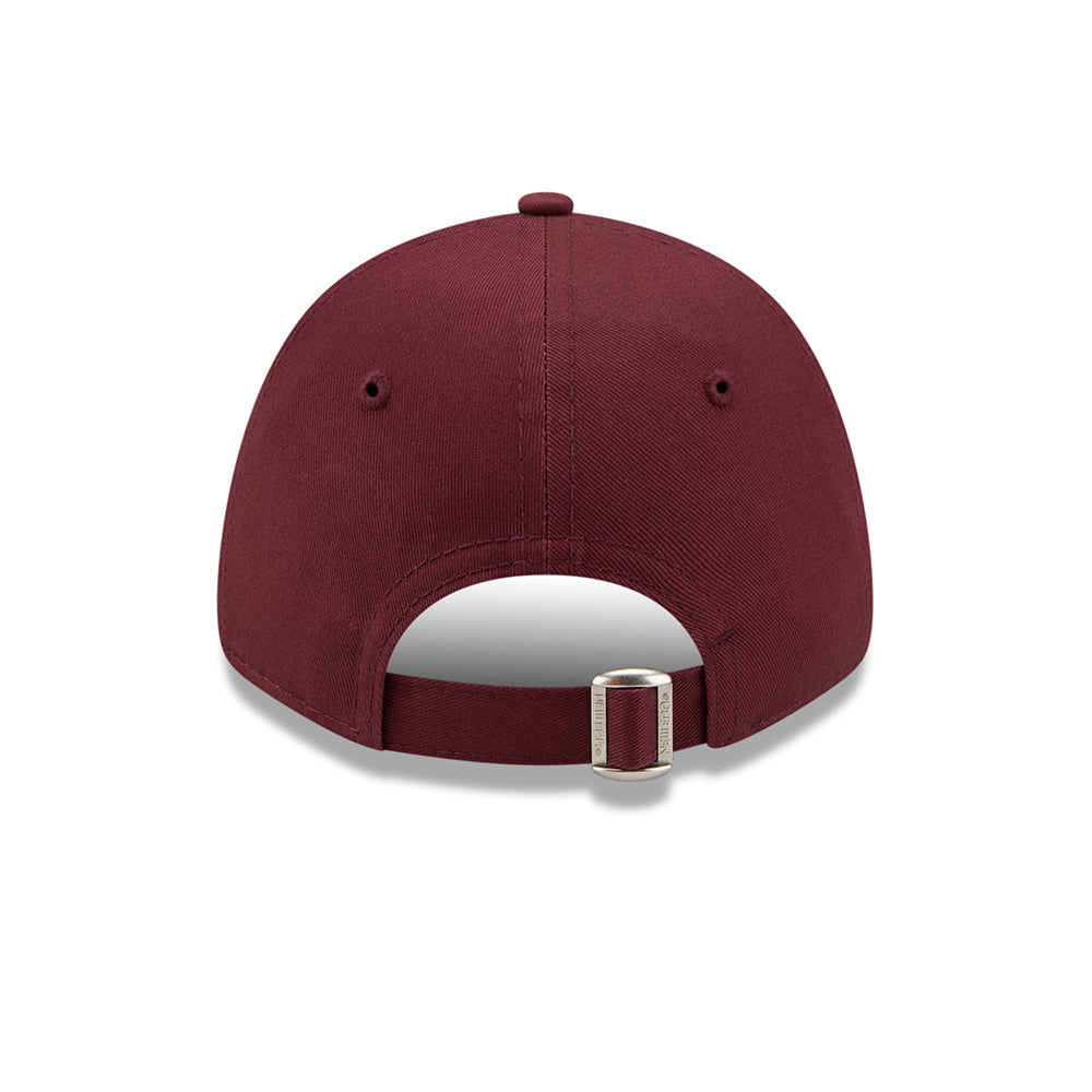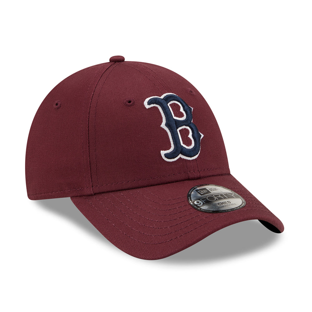 This is the New Era Kids 9FORTY Boston Red Sox MLB League Essential Baseball Cap in maroon-navy. The hat features the team logo embroidered on the front of the 100% cotton cap. The New Era logo is embroidered on the side and there is an adjustable strap at the back that should allow this hat to fit your young one's head.
