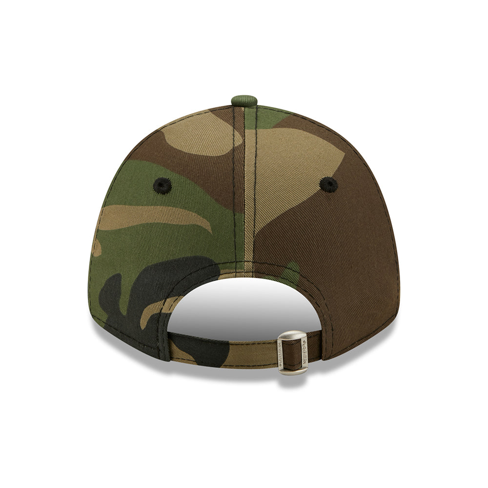 The New Era Kids 9FORTY Chicago Bulls Baseball Cap - MLB Camo Infill in Camouflage features the team's logo embroidered on the structured front panels and the New Era flag is embroidered on the left side. The six panel cap entirely covered in a camouflage print is made of 100% cotton and features breathable eyelets with a curved visor and button on top. The open back has an adjustable cotton strap with metal buckle so the hat fits comfortably.