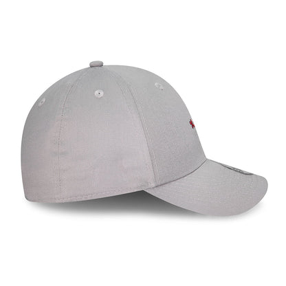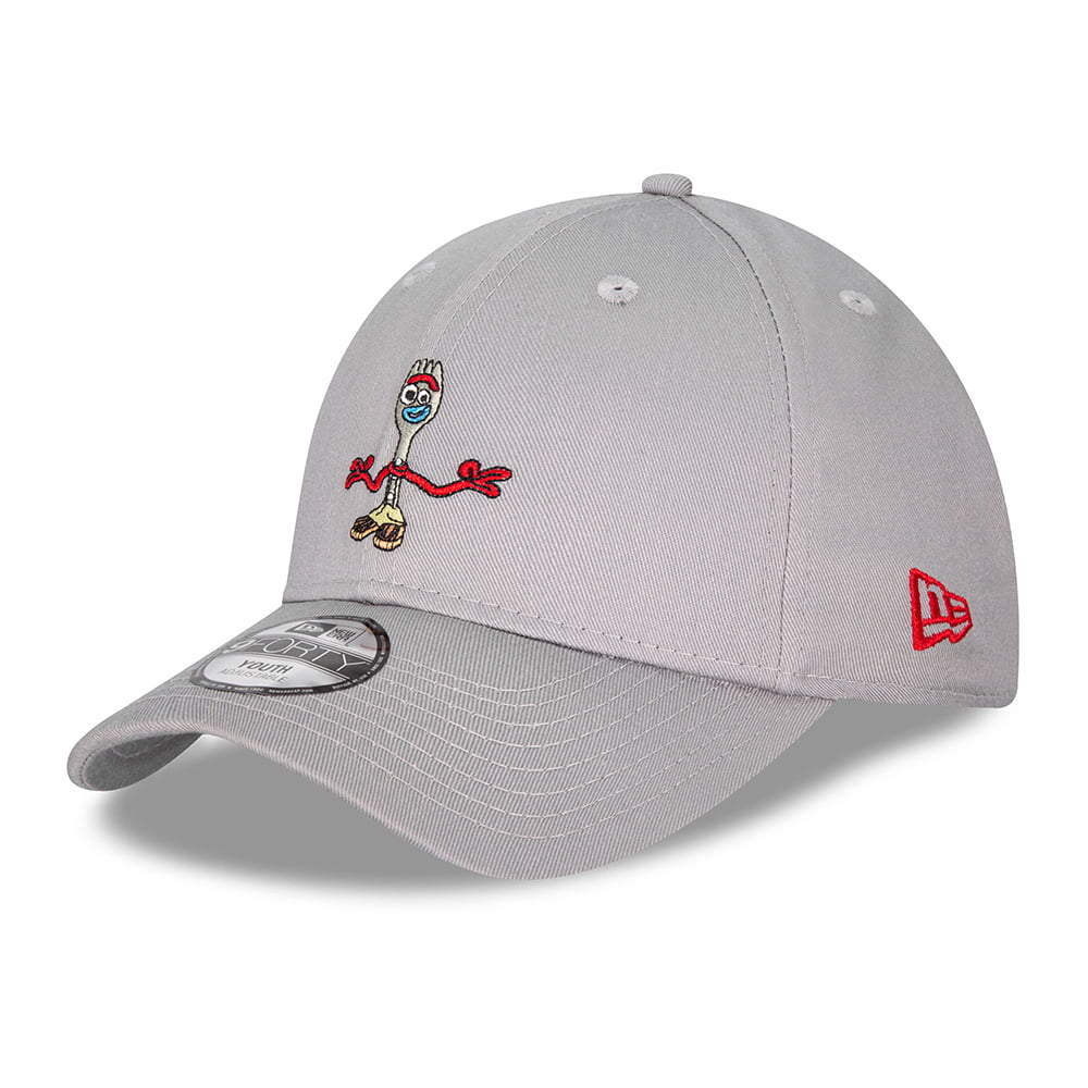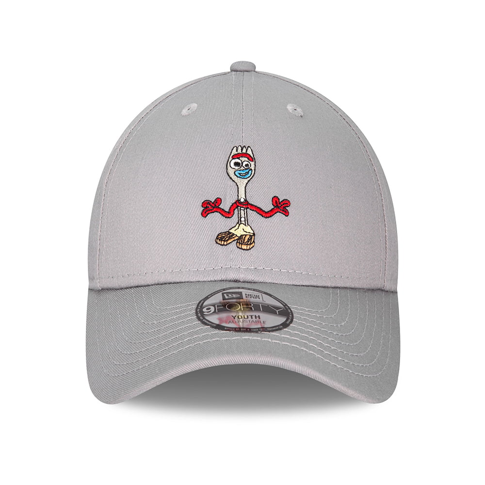 This is the New Era Kids 9FORTY Forky Toy Story Baseball Cap in grey. The cap features Forky embroidered on the front of the cap. The New Era flag is embroidered on the side of the hat and there is an adjustable strap at the back of the cap.