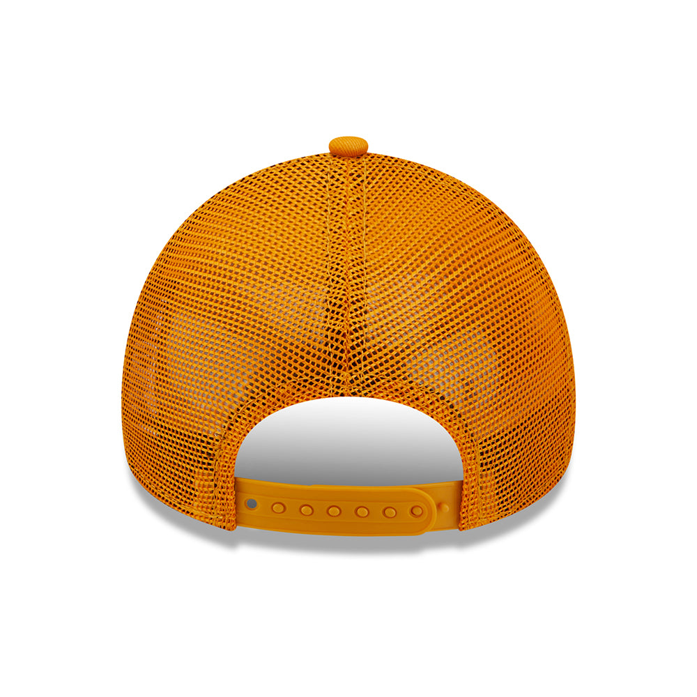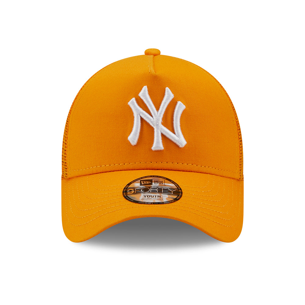 The New Era Kids 9FORTY New York Yankees MLB Tonal Mesh A-Frame Trucker Cap in orange features the team's logo embroidered on the structured front panel and the New Era flag embroidered on the left side. The back of the cap features mesh panels for breathability. There is an adjustable snap at the back for a perfect fit.