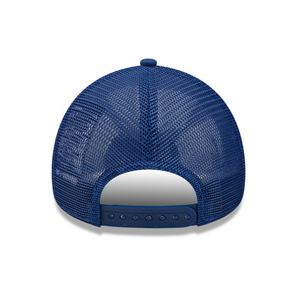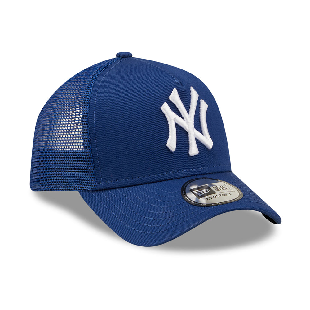 The New Era Kids 9FORTY New York Yankees MLB League Essential A-Frame Trucker Cap in royal blue-white features the team's logo embroidered on the structured front panel and the New Era flag embroidered on the left side. The back of the cap features mesh panels for breathability. There is an adjustable snap at the back for a perfect fit.