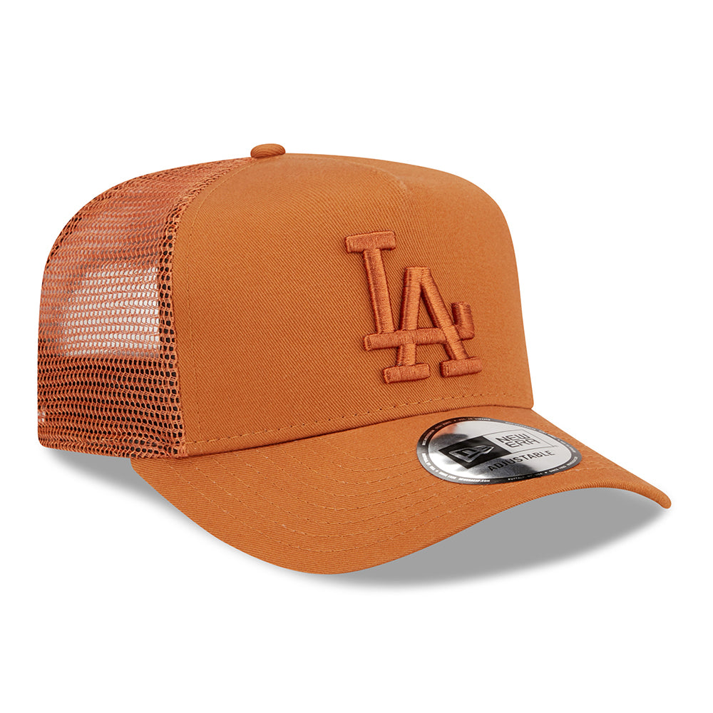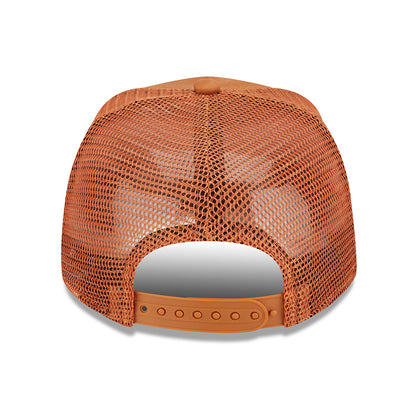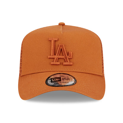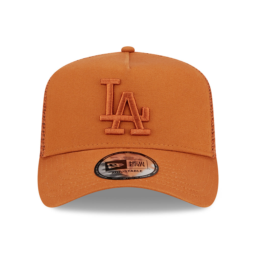 The New Era Kids L.A. Dodgers MLB Tonal Mesh A-Frame Trucker Cap in burnt orange features the team's logo embroidered on the structured front panel and the New Era flag embroidered on the left side. The back of the cap features mesh panels for breathability. There is an adjustable snap at the back for a perfect fit.