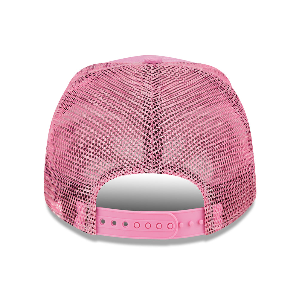 The New Era Kids L.A. Dodgers MLB Tonal Mesh A-Frame Trucker Cap in pink features the team's logo embroidered on the structured front panel and the New Era flag embroidered on the left side. The back of the cap features mesh panels for breathability. There is an adjustable snap at the back for a perfect fit.
