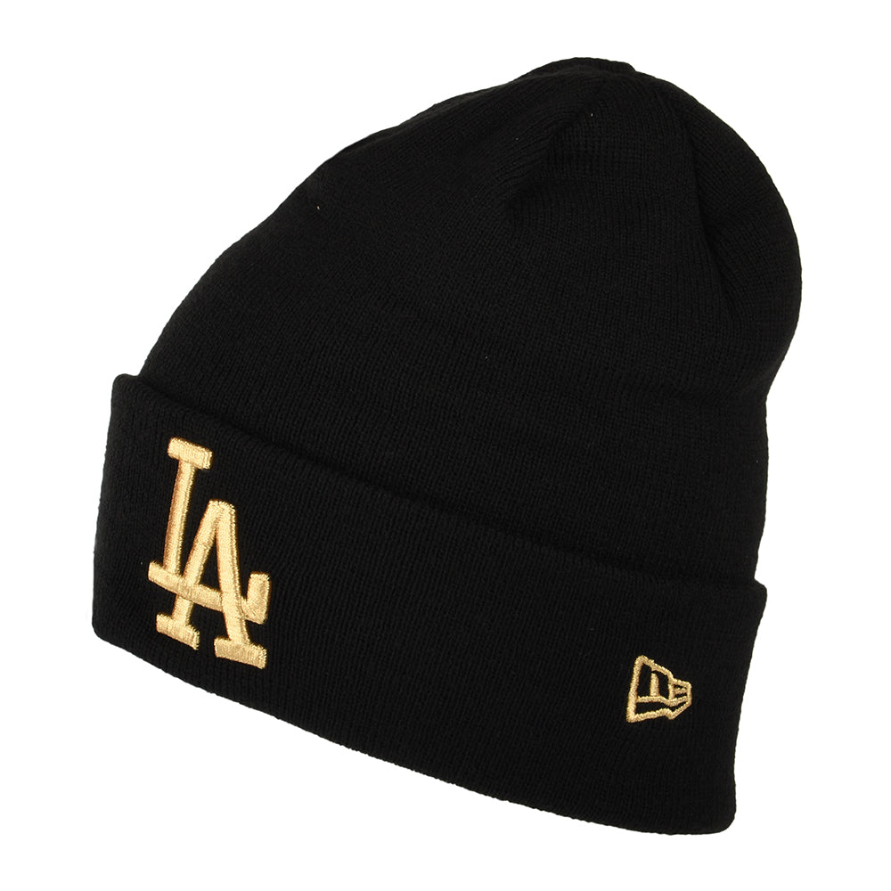 The New Era MLB Metallic L.A. Dodgers Cuffed Beanie Hat in black-gold is made of a soft acrylic yarn and features a metallic team logo embroidered on the front. The New Era flag is embroidered on the side. This is a great winter style as it is dual layered.